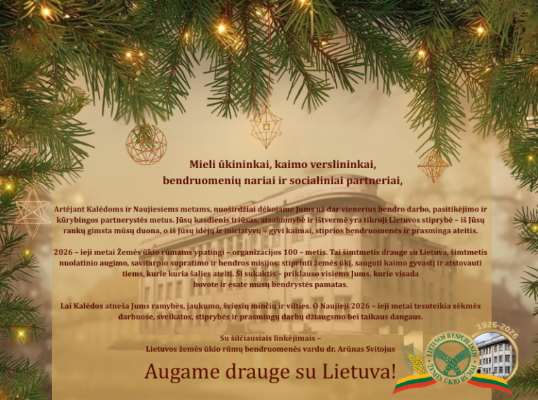 ŽŪR atstovai dalyvavo iškilmingame LPPARA metų apdovanojimų renginyje 2026-03-17 CEJA skubus pasitarimas: augančios sąnaudos kelia iššūkių jauniesiems ūkininkams visoje Europoje 2026-03-17 Rokiškio rajono bendruomenės – tarp aktyviausių „Lietuvos galios“ iniciatyvų dalyvių 2026-03-17 Europa negali būti strategiškai stipri be stipraus žemės ūkio 2026-03-17 Kviečiame į seminarą apie žemės dirbimo technologijų poveikį dirvožemio gyvybingumui 2026-03-16 Kaziuko mugė Kaune šiemet skirta Žemės ūkio rūmų šimtmečiui 2026-03-15 ŽŪR Tarybos posėdyje – diskusijos dėl komitetų, naujų iniciatyvų ir pasirengimo 100-mečiui 2026-03-15 Kaziuko mugė Kaune – su pagarba tradicijoms ir Žemės ūkio rūmų šimtmečiui 2026-03-13 Jūsų naršyklė nepalaiko video formato. A. Pabedinskienė: „Europos maisto politika turi remti ūkininkus, o ne tik reguliuoti rinką“ 2026-03-12 Su Kovo 11-ąja – Lietuvos Nepriklausomybės atkūrimo diena! 2026-03-11 Pieno sektorius Europoje: kainų skirtumai ir iššūkiai Lietuvai 2026-03-09 ŽŪR atstovų vizitas Moldovoje – pažintis su Sireți savivaldybės patirtimi 2026-03-09 Prancūzija stiprina maisto suverenitetą: prasideda regioninis žemės ūkio strategijos etapas 2026-03-06 Moldovoje – tarptautinis agromaisto investicijų forumas: ŽŪR atstovai kalba apie partnerystę ir regiono plėtros galimybes 2026-03-05 Po Maisto tarybos diskusijos prekybos tinkluose – ryškios pieno produktų nuolaidos: ką rodo pieno kainų grandinė? 2026-03-05 Briuselyje diskutuota apie pieno sektoriaus ateitį: jaunieji ūkininkai kelia kainų netolygumo problemą ES 2026-03-05 Copa-Cogeca rengia rašto projektą dėl ES klimato kaitos atsparumo programos: nuo deklaracijų prie realių sprendimų ūkiuose ir miškuose 2026-03-04 Copa-Cogeca prezidiume: akcentai nuo BŽŪP po 2027 m. iki trąšų, biodujų ir vilnos žiediškumo 2026-03-02 XXVI ŽŪR suvažiavime – istorinė lyderystė: pirmą kartą išrinkta moteris pirmininkė 2026-02-26 Kviečiame į nuotolinį renginį apie žemės ūkio technikos našumo metodikos taikymą ir pakeitimus 2026-02-26 Nuo vasario 27 d. NMA pradės mokėti paramą pagal priemonės „Gyvūnų gerovė“ veiklas 2026-02-26 EP stiprina ūkininkų apsaugą nuo nesąžiningos prekybos praktikos 2026-02-25 ŽŪR kandidatų į pirmininkus strategijų pristatymai 2026-02-23 Plungėje – konferencija Žemės ūkio rūmų 100-mečiui: nederlingų žemių ir šeimos ūkių išlikimas tampa nacionaliniu prioritetu 2026-02-23 VMVT atmintinė gyvūnų laikytojams: pasitikrinkite, ar esate saugioje nuo potvynių zonoje 2026-02-22 Artėjant pasėlių deklaravimui, keičiamos administravimo ir kontrolės taisyklės 2026-02-22 Skaitmeninė pažanga ūkiuose: 10 šalies ūkių taps inovacijų demonstravimo erdve 2026-02-18 Dr. Arūnas Svitojus: „CBAM negali tapti nauja krize Europos žemės ūkiui“ 2026-02-18 Seimo pirmininkas kviečia kauniečius į susitikimą 2026-02-17 Konferencija Plungėje: nederlingų žemių ūkių ir šeimos ūkių ateitis naujame ES finansiniame laikotarpyje 2026-02-17