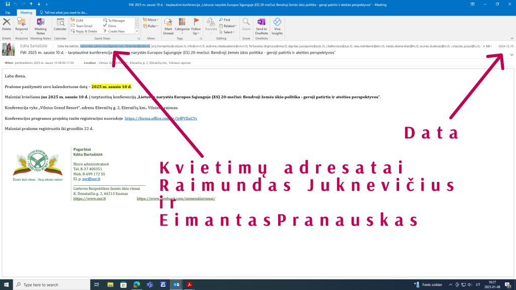 Žemiau pateikiame nukopijuotus kompiuterio ekrano vaizdus, kuriuose aiškiai matyti, kam ir kada buvo išsiųsti kvietimai su prašymu registruotis į konferenciją iki 2024 m. gruodžio 22 d.