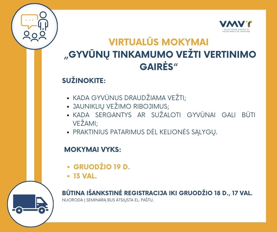Valstybinė maisto ir veterinarijos tarnyba (VMVT) gruodžio 19 d. kviečia į mokymus, skirtus ūkinių gyvūnų vežėjams, laikytojams ir visiems, kuriems rūpi gyvūnų gerovė transportavimo metu.