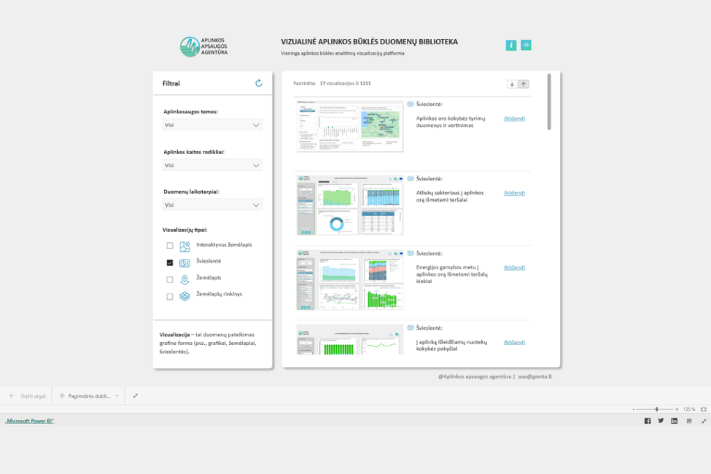 Nuo šiol naudotis šiais interaktyviais įrankiais bus dar patogiau. Agentūros analitikų parengtos švieslentės, GIS žemėlapiai, žemėlapių rinkiniai skelbiami vienoje vietoje – vizualinėje aplinkos būklės duomenų bibliotekoje.