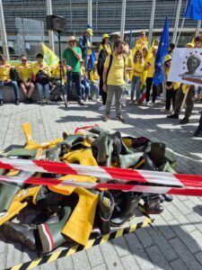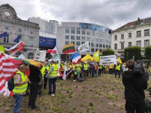 The symbolic protest began in front of the European Parliament (EP), from where concerned farmers marched toward the European Commission (EC) headquarters. There, they carried out a symbolic act—piling up rubber agricultural boots.